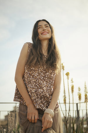 Sparkly Palia caramel sequined top that matches the Yani skirt. The perfect combination for a night out or to tone down a bit throw on a denim or leather jacket!