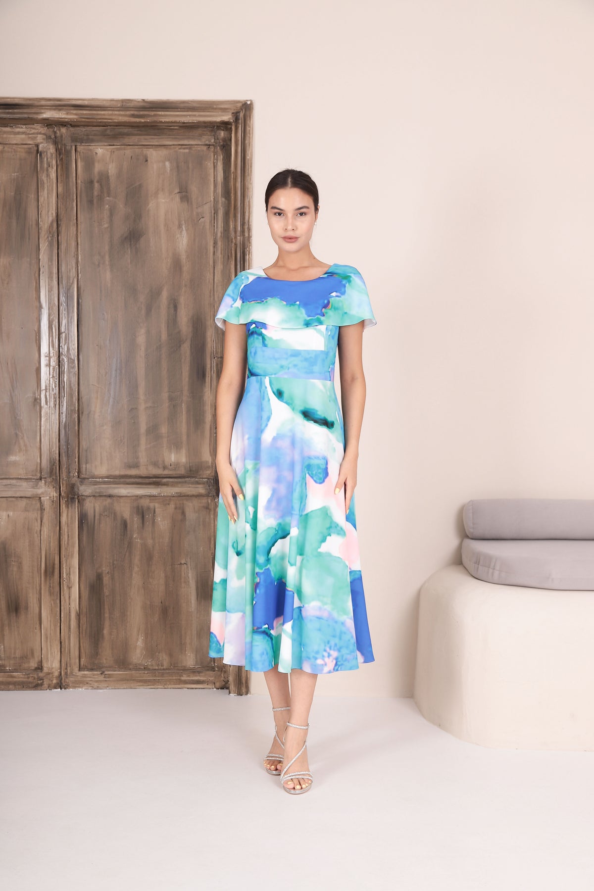 A stunning sapphire blue patterned dress.  The bodice has a wide shawl neckline whilst the skirt is flared.