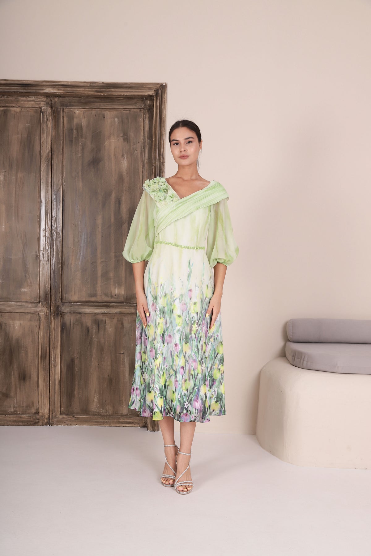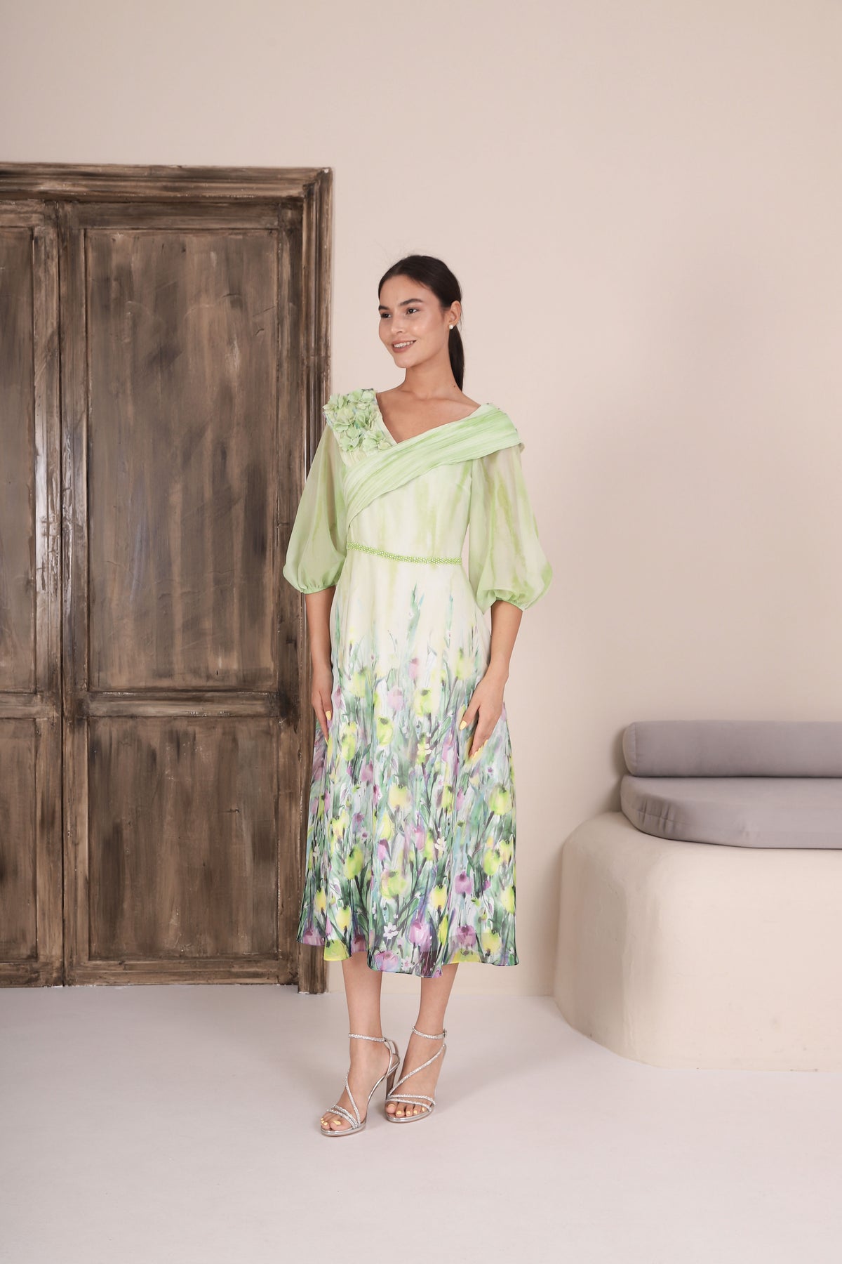 A beautiful, feminine dress in lime chiffon. The bodice has a cross body style creating a wide neckline. The sleeves are full gathered at the elbow. The right shoulder has 3D floral detail. The skirt is flared and has a contrasting floral pattern in pink and lemon. The waist is finished with diamanté.