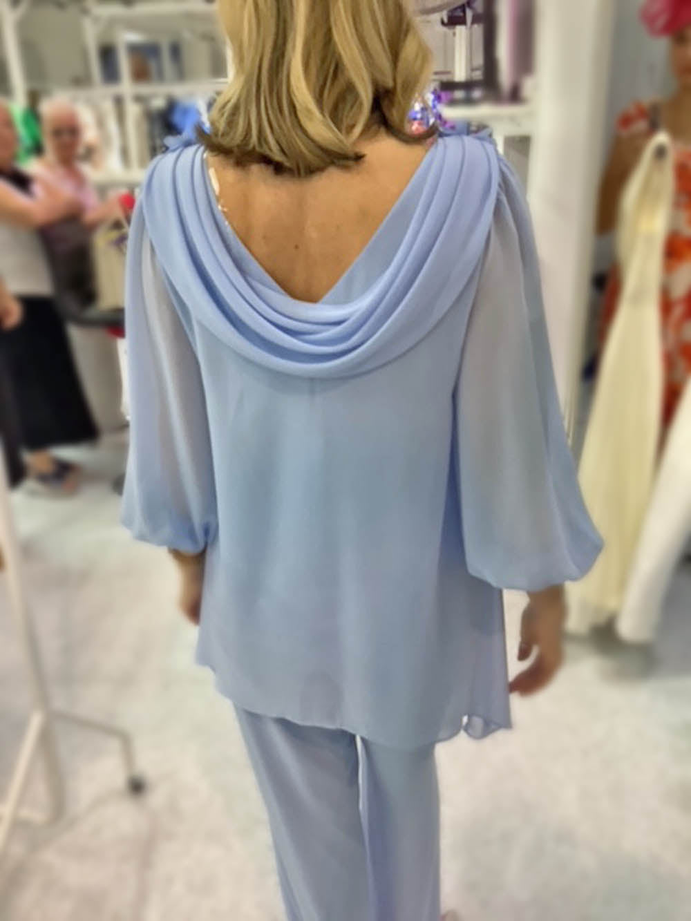 A beautiful chiffon trouser suit in vista blue. the tunic has a V-neckline, 3/4 puff sleeves and 3D floral detail at the shoulders. The back of the tunic features a draped cowl. The trousers are straight and have an elasticated waist.
