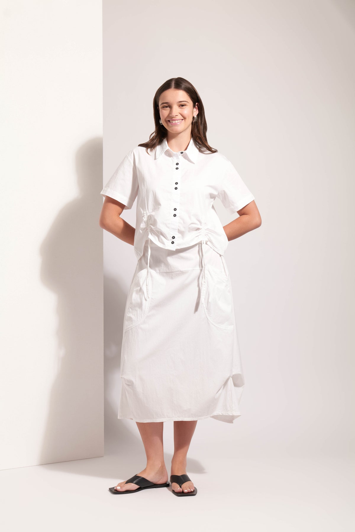 Crisp white loose fit cotton mix shirt with short sleeves, vertical gather detail and contrasting buttons.